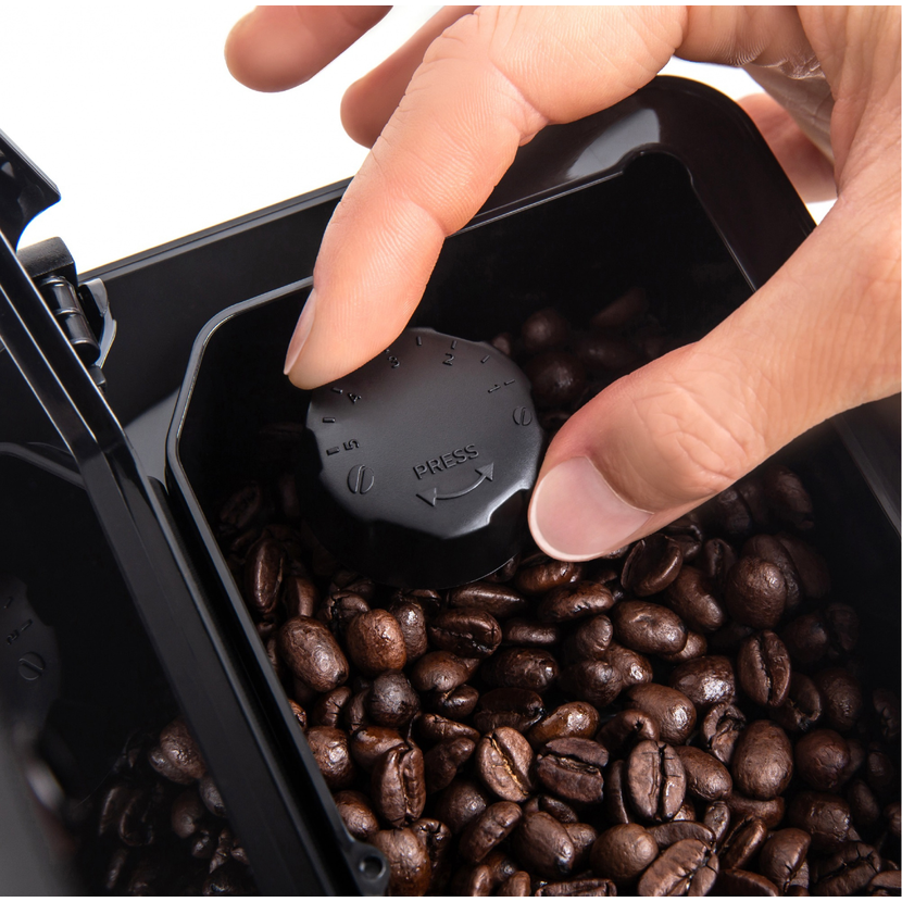 Voda i káva se plní seshora. Zásobník na vodu pojme až 1,8 l vody, do zásobníku na kávu se vejde 250 g čerstvě pražené kávy. Kávu Vám čerstvě namele tichý a přesný keramický mlýnek, který nabízí 5 stupňů nastavení hrubosti mletí. Je tu i otvor pro nasypání mleté kávy, což se hodí například, když potřebujete připravit bezkofeinovou kávu.